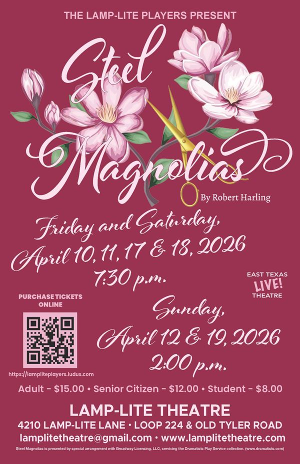 Tickets to performances of STEEL MAGNOLIAS will be available beginning on February 23, 2026, and can ONLY be purchased online. Any unsold tickets will be available for purchase at the Lamp-Lite Theatre box office 45 minutes before each performance.